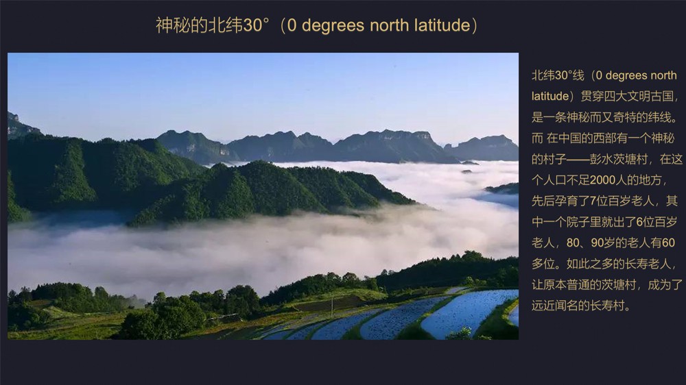 北纬30°线(0 degrees north latitude)贯穿四大文明古国,是一条神秘而又奇特的纬线。 而 在中国的西部有一个神秘的村子——彭水茨塘村,在这个人口不足2000人的地方,先后孕育了7位百岁老人,其中一个院子里就出了6位百岁老人,80、90岁的老人有60多位。如此之多的长寿老人,让原本普通的茨塘村,成为了远近闻名的长寿村。